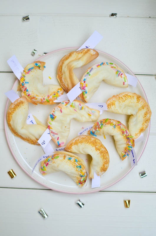 Schreibe die Aufgaben auf kleine Zettel und verstecke Sie in selbstgemachten Glückskeksen. Wie das funktioniert kannst Du hier nachlesen.