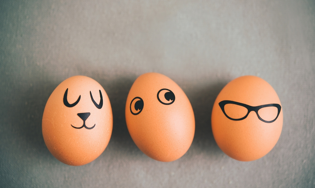 Auch sehr minimalistisch, aber lustig und dekorativ. Die Brille des rechten Eies sieht aus, wie eine der Riesenbrillen aus unseren Requisiten. Das Ei scheint ready für ein Foto mit unserer Fotobox, die mit eben diesen Requisiten geliefert wird.
