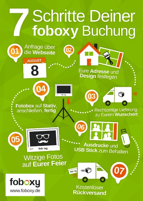 Und wenn Deine Veranstaltung aus irgendeinem Grund verschoben werden muss gibt es bei foboxy eine 100%ige Verschiebegarantie – solange die Box noch nicht versendet wurde.